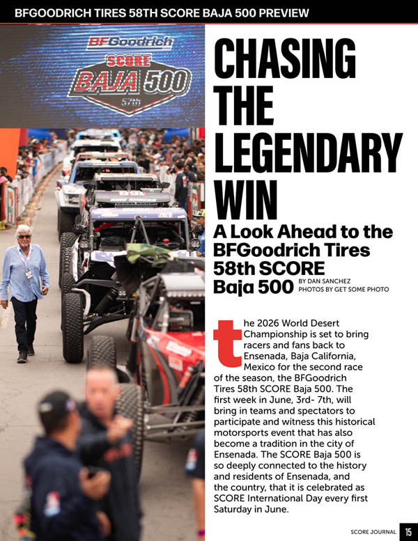 The BFGoodrich Tires 58th SCORE Baja 500Round 2 of the four-race 2026 SCORE World Desert Championship, will be held June 3-7 in Ensenada, Baja California, Mexico. Race Day (Saturday, June 6) will once again be recognized as SCORE International Day in Ensenada.