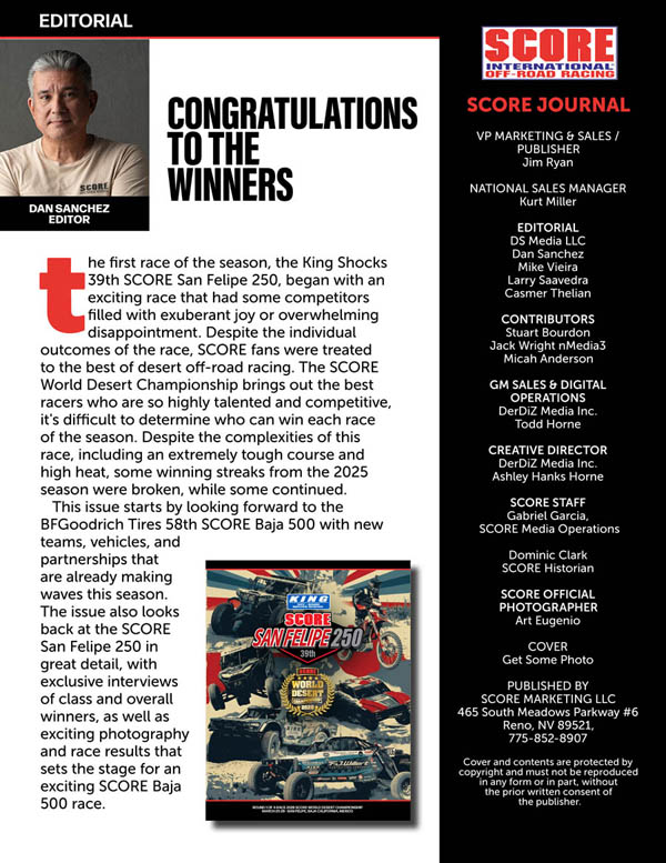 La Segunda fecha del Campeonato Mundial del Desierto 2026 de SCORE International contará con la celebración del Día de SCORE International durante el Sábado 6 de Junio en “La Capital Mundial del Off-Road”, Ensenada, Baja California, México, las inscripciones para corredores e información de la carrera está en www.SCORE-International.com