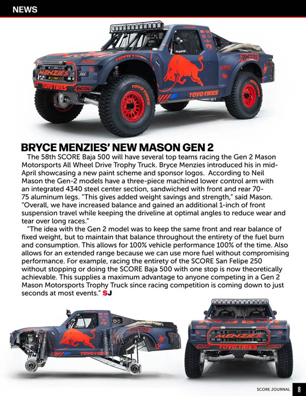 Among the drivers from other motorsport disciplines who have tested the Baja 500 have been Indy Car racers Rick Mears, Roger Mears, Parnelli Jones, Danny Ongias, Danny Sullivan, Jimmy Vasser, Roberto Guerrero, Michel Jourdain Jr., Johnny Unser and Mike and Robbie Groff, NASCAR’s Robby Gordon, Jimmie Johnson, Boris Said, Brendan Gaughan and Casey Mears, SCCA legend Elliot Forbes-Robinson, Pike’s Peak Hill Climb record holder Rod Millen, Drifting and Pike’s Peak champion Rhys Millen, World Rally Championship’s Armin Schwarz, Armin Kremer, Andreas Aigner and Harri Rovanperä, world motorcycle champions Malcolm Smith, Larry Roeseler and Destry Abbott, Motocross legends Ricky Johnson and Jeremy McGrath, Dakar Rally Champions Brock Heger, Ricky Brabec, Cyril Despres, Marc Coma and Toby Price, XGames star Travis Pastrana, Sports Car champion Larry Connor, drag racers Don Prudhomme and Larry Minor and legendary SCORE founder and motorsports innovator Mickey Thompson.